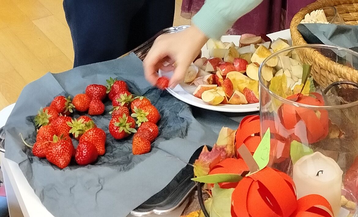 Die Ernte wurde am nächsten Tag in der Klasse genossen - entweder als kleiner Früchtespieß oder direkt in den Mund. (K. Eckmann)