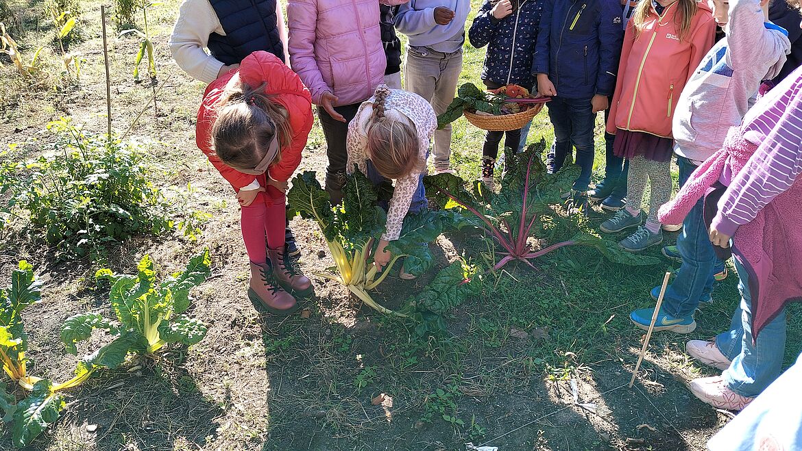 Kleine geschickte und fleißige Hände ernteten Äpfel, Birnen, Mangold, Tomaten und sogar noch Erdbeeren. Mit dem gut gefüllten Erntekörbchen machte sich die Klasse wortwörtlich „glücklich vom Acker“.