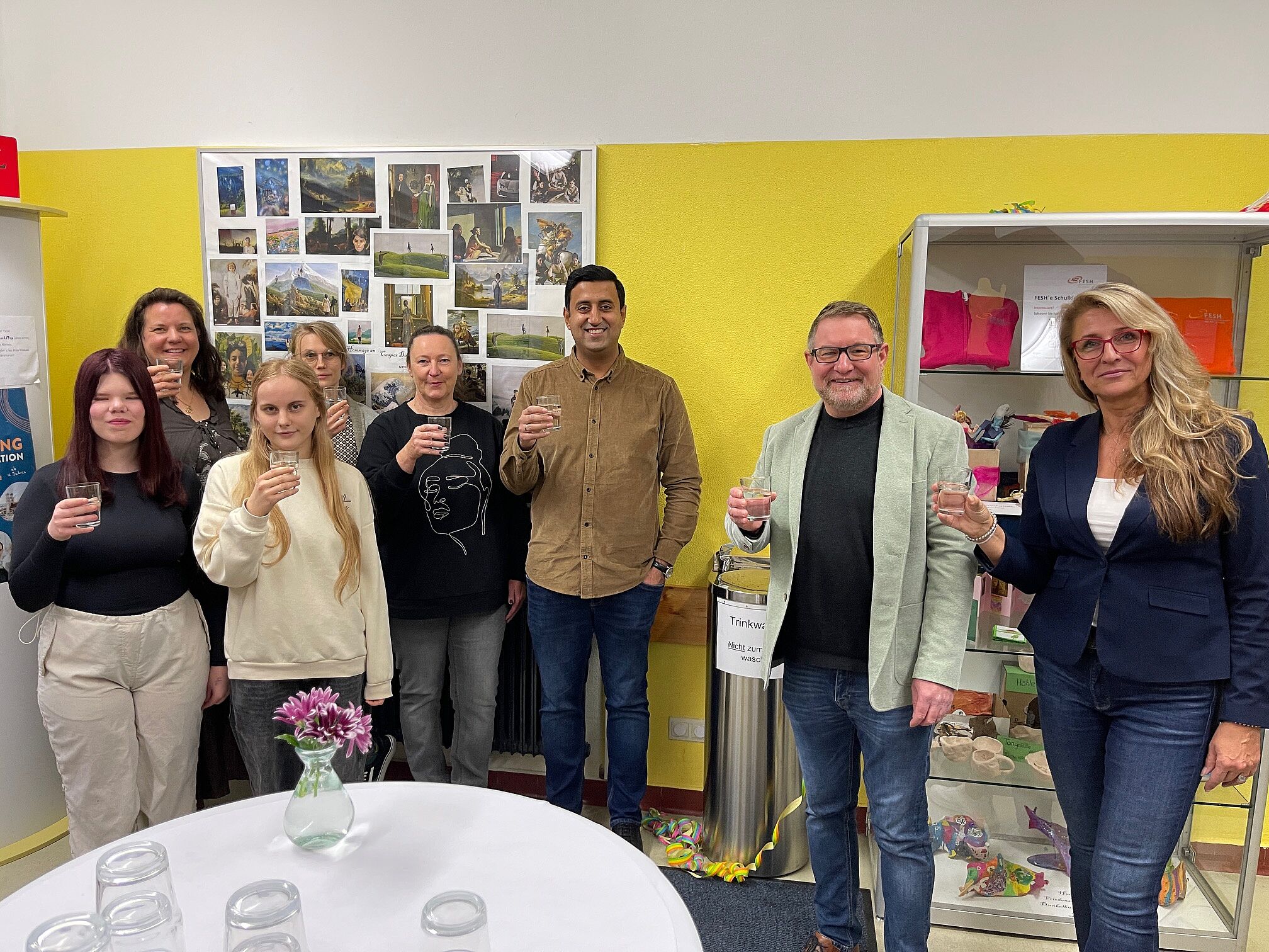 Eltern aus dem Freundes- und Ehemaligen-Verein der KGS, den „FESHen friends“, hatten die Idee, mit Unterstützung der Schulleitung im Foyer der KGS einen Trinkbrunnen zu installieren, damit die Schülerinnen und Schüler jederzeit ausreichend ganz frisches Wasser trinken und sich sogar ihre Trinkflaschen auffüllen können. Schon bald konnte sogar der Bezirksrat des Stadtbezirks Bothfeld-Vahrenheide dafür gewonnen werden, das Vorhaben finanziell zu unterstützen, so dass es zügig umgesetzt wurde.