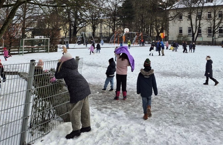 Dank der glänzenden Pracht ergeben sich auf dem Schulhof in den Pausen und nachmittags in der Ganztagsbetreuung ganz neue Möglichkeiten – Schneemänner, Schneebälle (Vorsicht: Fenster!), Tierspuren suchen, Schneeengel…