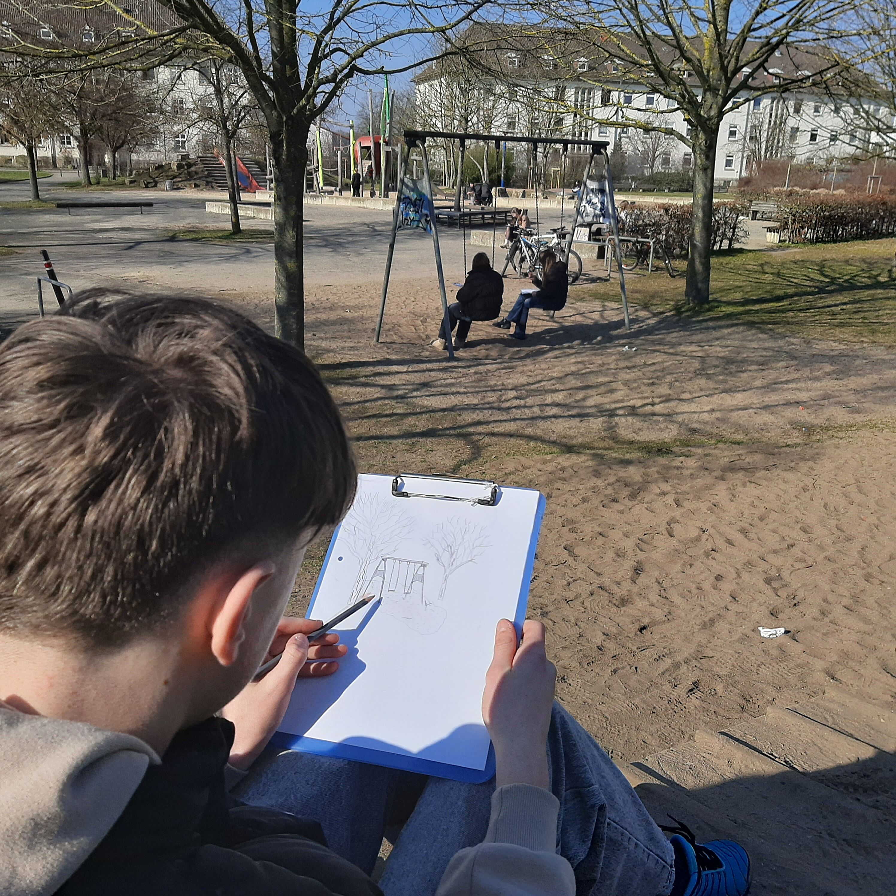 Inspiriert von der erwachenden Natur erlebten die Schülerinnen und Schüler, wie freudebringend das stimmungsvolle Zeichnen im Freien sein kann. Bei bester Stimmung genossen sie diese „Zeichenerfahrung“ und wendeten die „raumschaffenden Mittel“ an, um die es beim dann auch beim nächsten Test gehen sollte: Staffelung, Überlappung, Schärfe und Größe. (Text H. Nikolov, Fotos M. Erhardt)